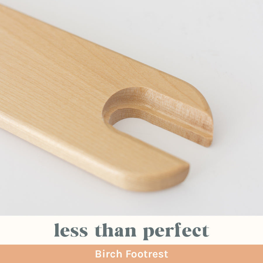 We are selling our "less than perfect" footrests at a discount. Possible defects include (but are not limited to): Knicks, drastic variances in color, inconsistent varnish coverage. Sometimes the imperfection only affects one side and sometimes it affects both sides. All are functional as highchair footrests.